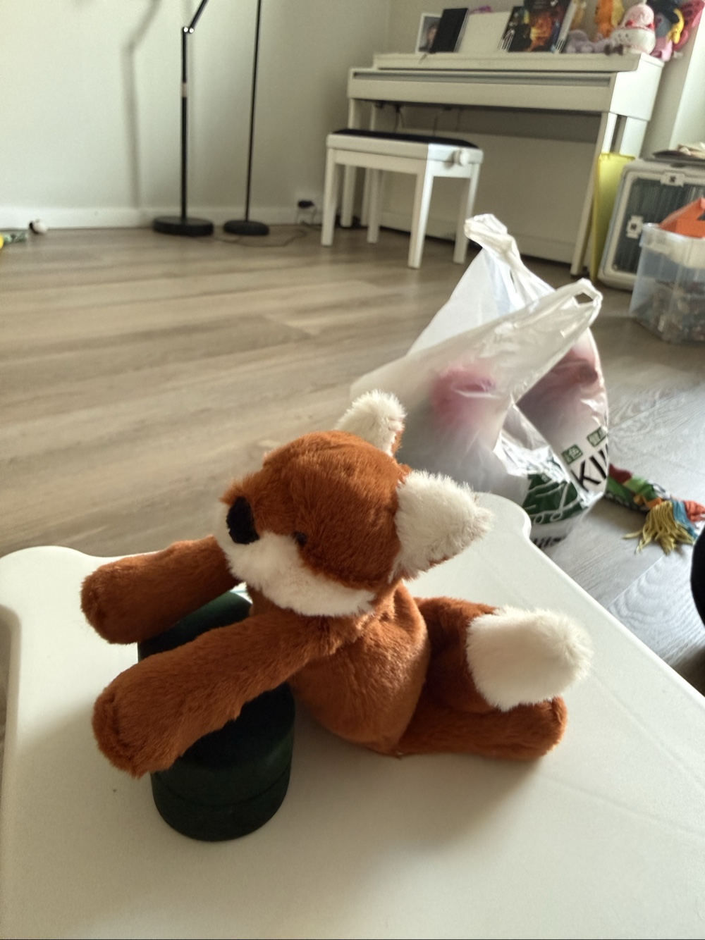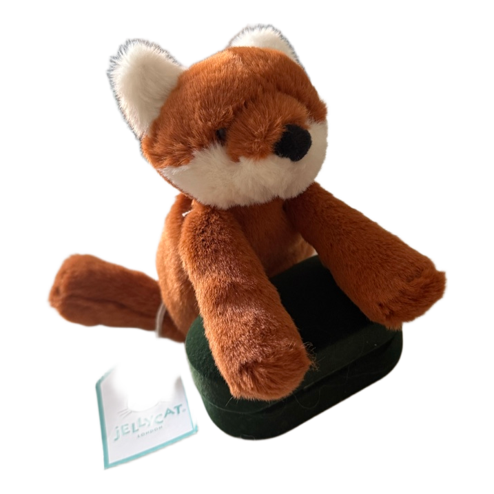Small brown fox plush toy by Jellycat. Features white accents on ears and tail, with original brand tag attached.