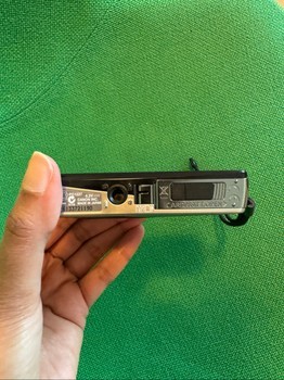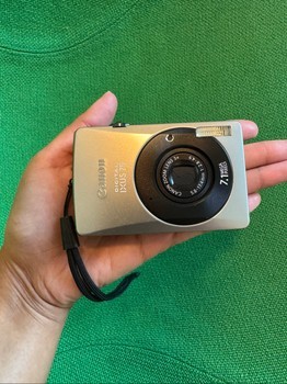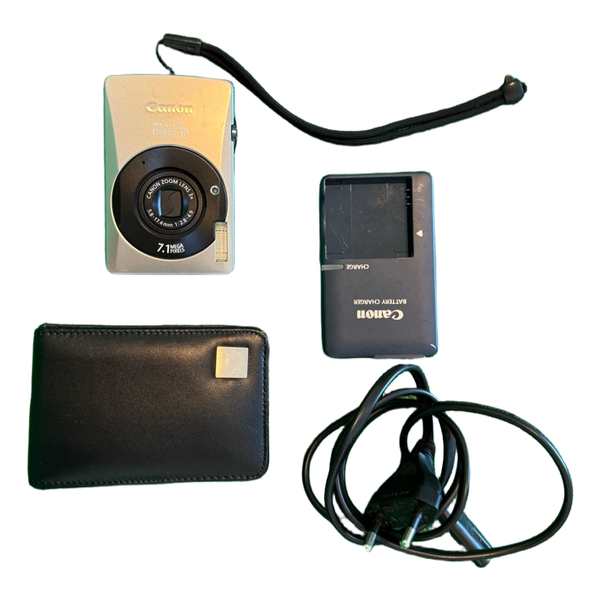 Canon Digital Ixus 75 digital camera with charger. Silver-coloured body.