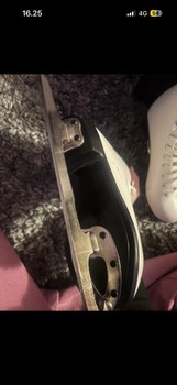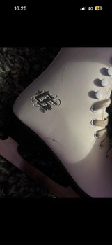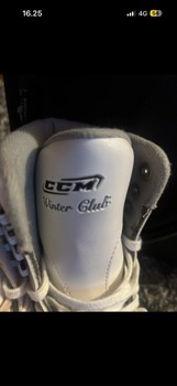 White CCM Winter Club skates. The skates have metal blades. One lace is stained but with replacement they are good. Size 35