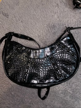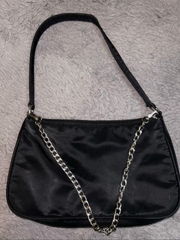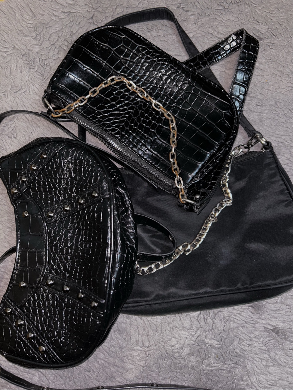 Set of three black handbags. Includes two crocodile-effect bags with chain details and one plain nylon style shoulder bag.