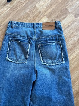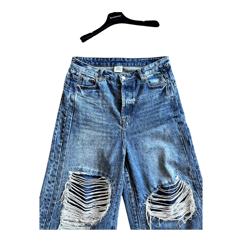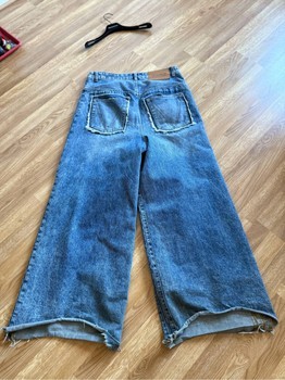 Blue denim jeans with wide legs and distressed knees. Features raw hem detailing and branded back patch.