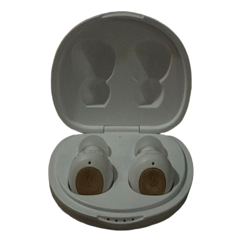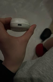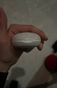 White wireless earbuds with charging case. Case has USB-C charging port and indicator lights.