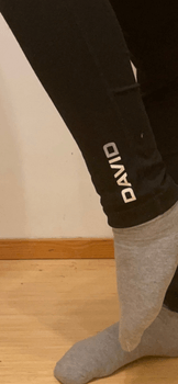 Black, smooth-surfaced training tights/sports leggings. Heavily used, but the condition is hardly noticeable. On the front at the thighs small pilling, which is noticeable when inspected up close. Color black. On one leg at the ankle a mark "David". I am 163 cm tall.