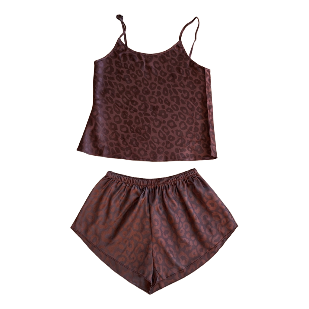 Two-piece pajama set in brown with a leopard pattern. Features a camisole top and matching shorts with an elasticated waistband.