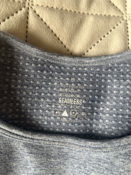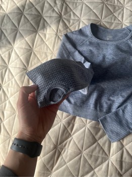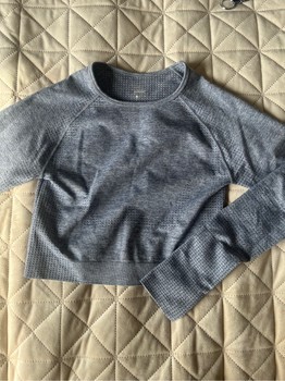 Long-sleeved sports top with a seamless design, thumb holes, and a round neckline. Size M.