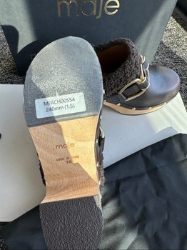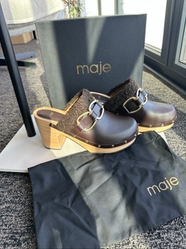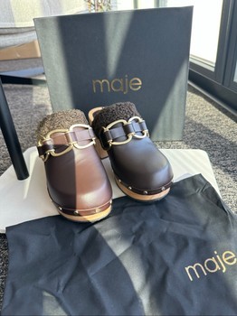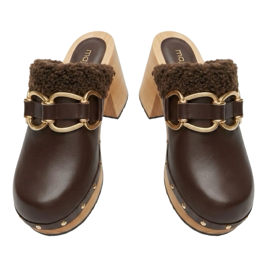 Brown leather clogs with gold-tone hardware and faux fur trim. Wooden sole. Size 38.