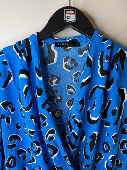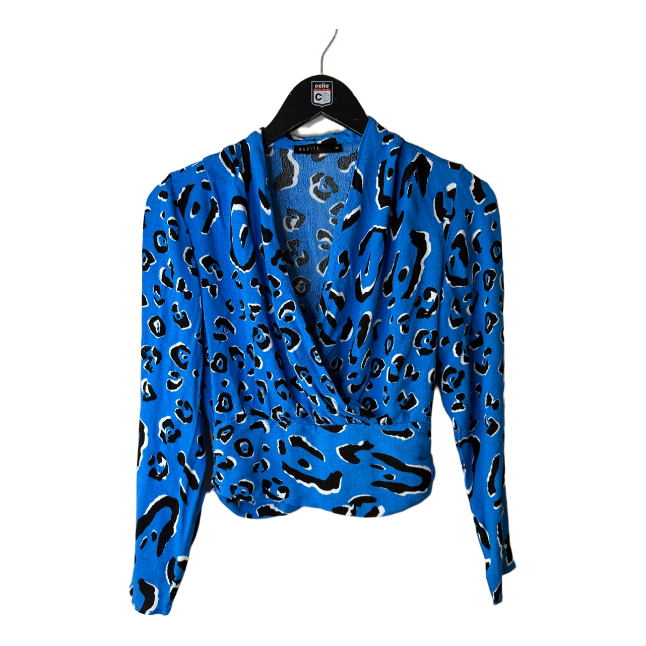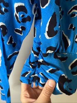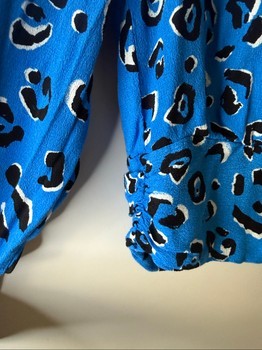Blue long-sleeved blouse with a black and white leopard pattern. Features a wrap-style front and ruched side detail. Size 34.