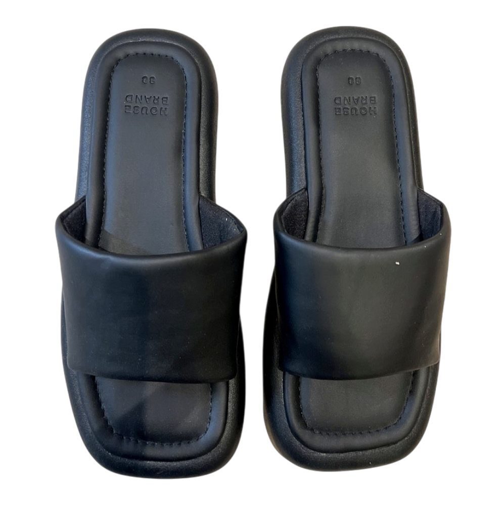 Black slide sandals with a padded strap. Square toe design. Size 38