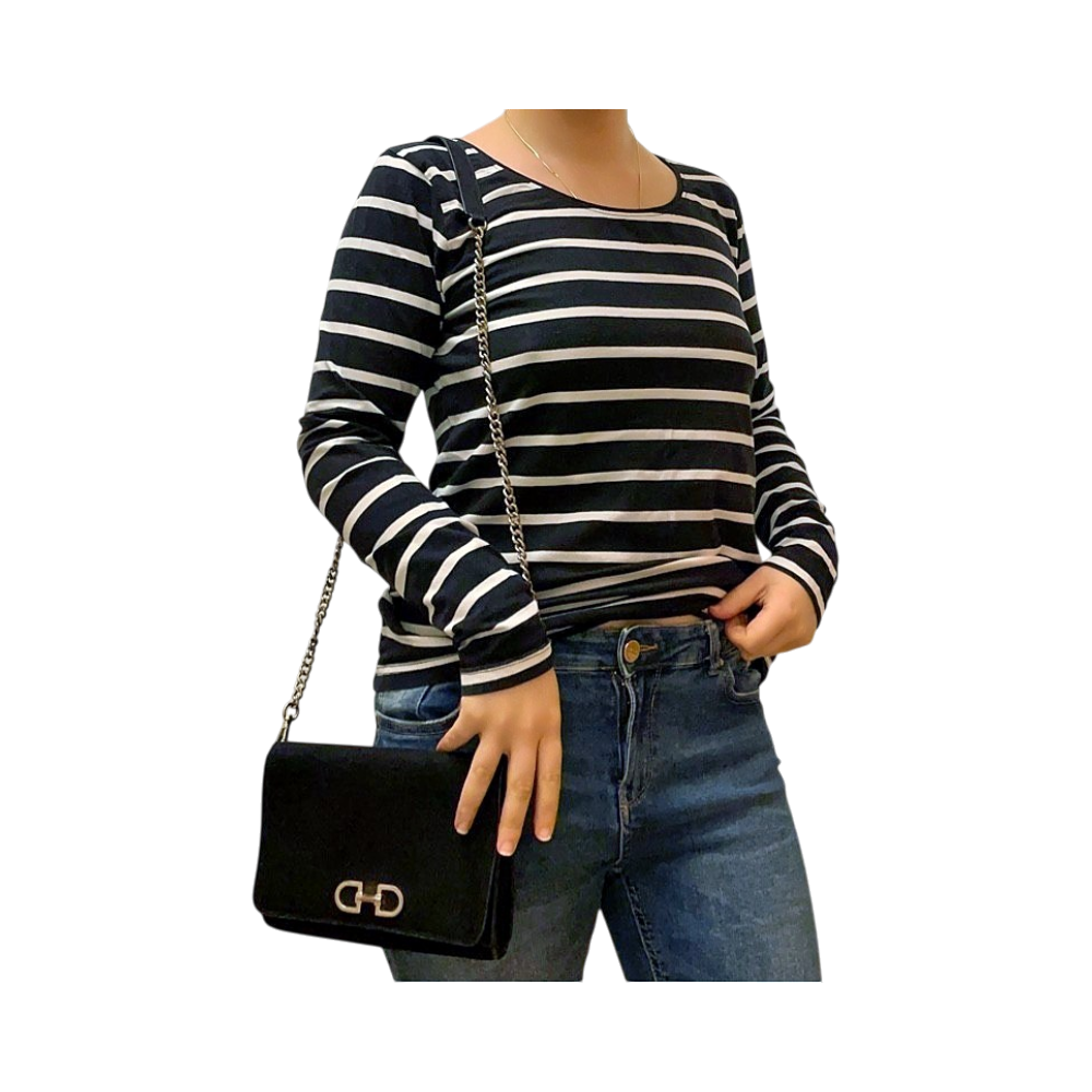 Women's black and white striped long-sleeved shirt. Shown on size S. #cotton #cotton