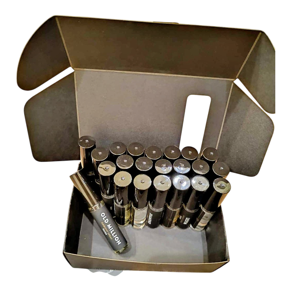 Set of Aromatic89 ambient spray testers in a black display box. Includes multiple small spray bottles. 24pcs