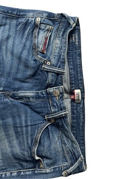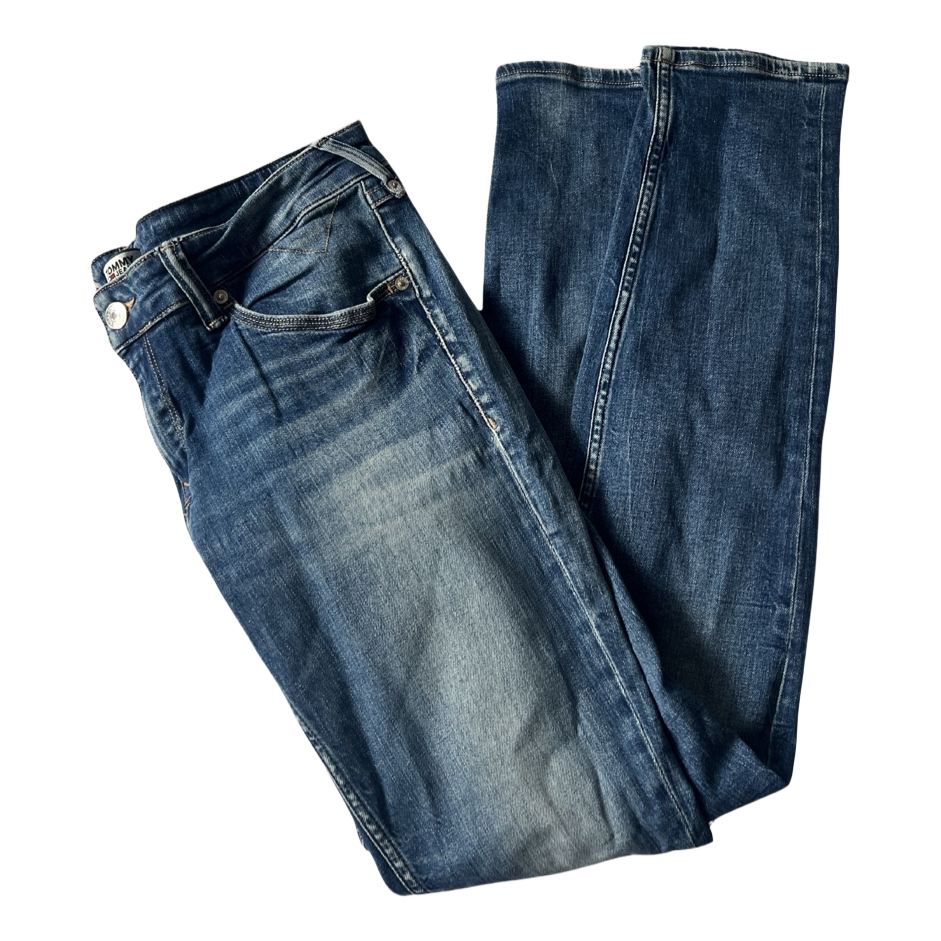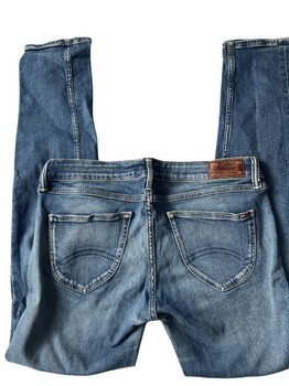 Blue denim jeans with a low-rise, skinny fit. Features five-pocket styling and a branded leather patch at the back.