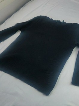 Multi-use black rib knit top. The top has a boat neckline and soft, stretchy material. 3/4 sleeves.