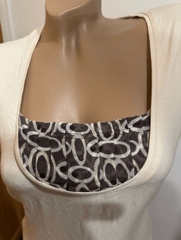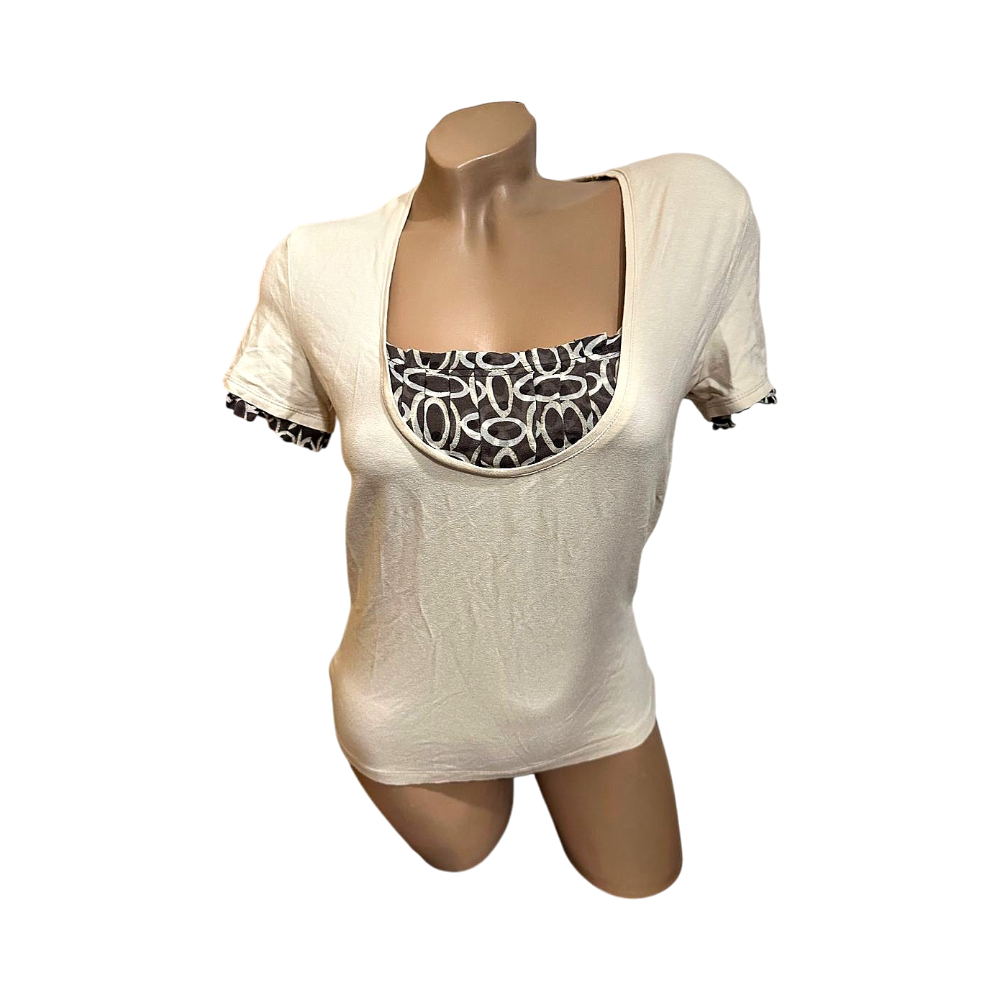 Casual beige top with a unique patterned insert at the neckline. Soft fabric, suitable for everyday wear.