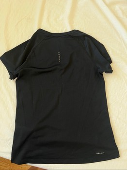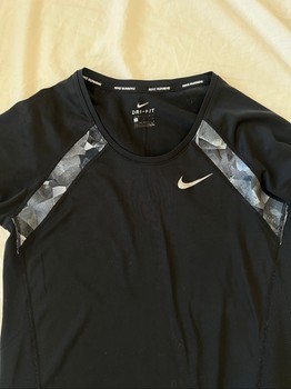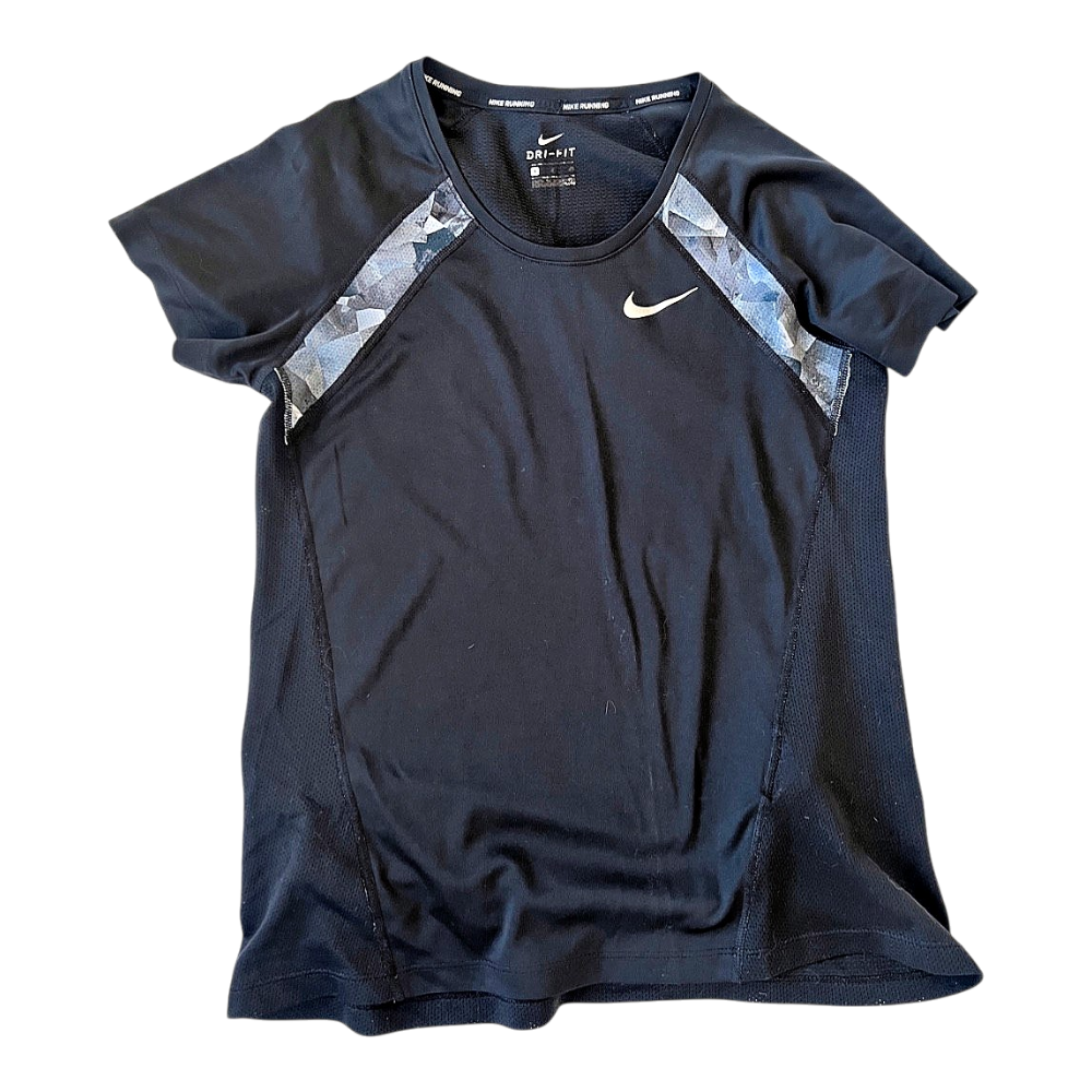 Black Nike Dri-Fit running shirt. Short-sleeve model with gray patterned details on the shoulders. Size S.