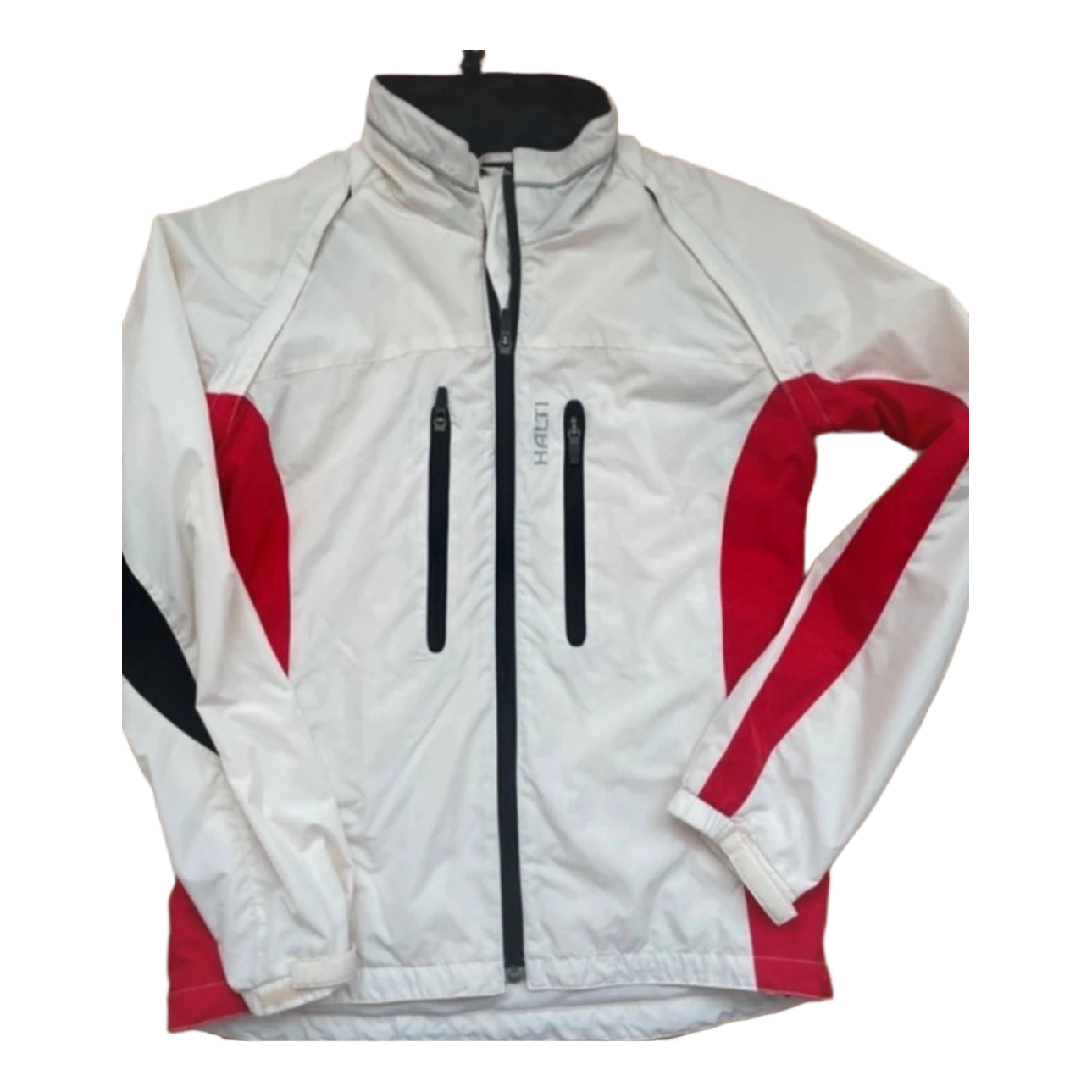 From the jacket, if desired, you can get a vest by removing the sleeves (zippered). High-quality, intact and good jacket still for the next user ☺️ Size 36/S, corresponds well to a relaxed S size. Halti sports jacket for women, size S. Coloration white with red and black details. Front full-length zipper and two vertical zip pockets on the chest. Velcro adjustment at cuffs and drawcord at hem. Lightweight shell/wind/sports jacket, suitable for various outdoor and sports activities. Jacket has Halti logos on chest and sleeve. Price is already reduced and fixed.