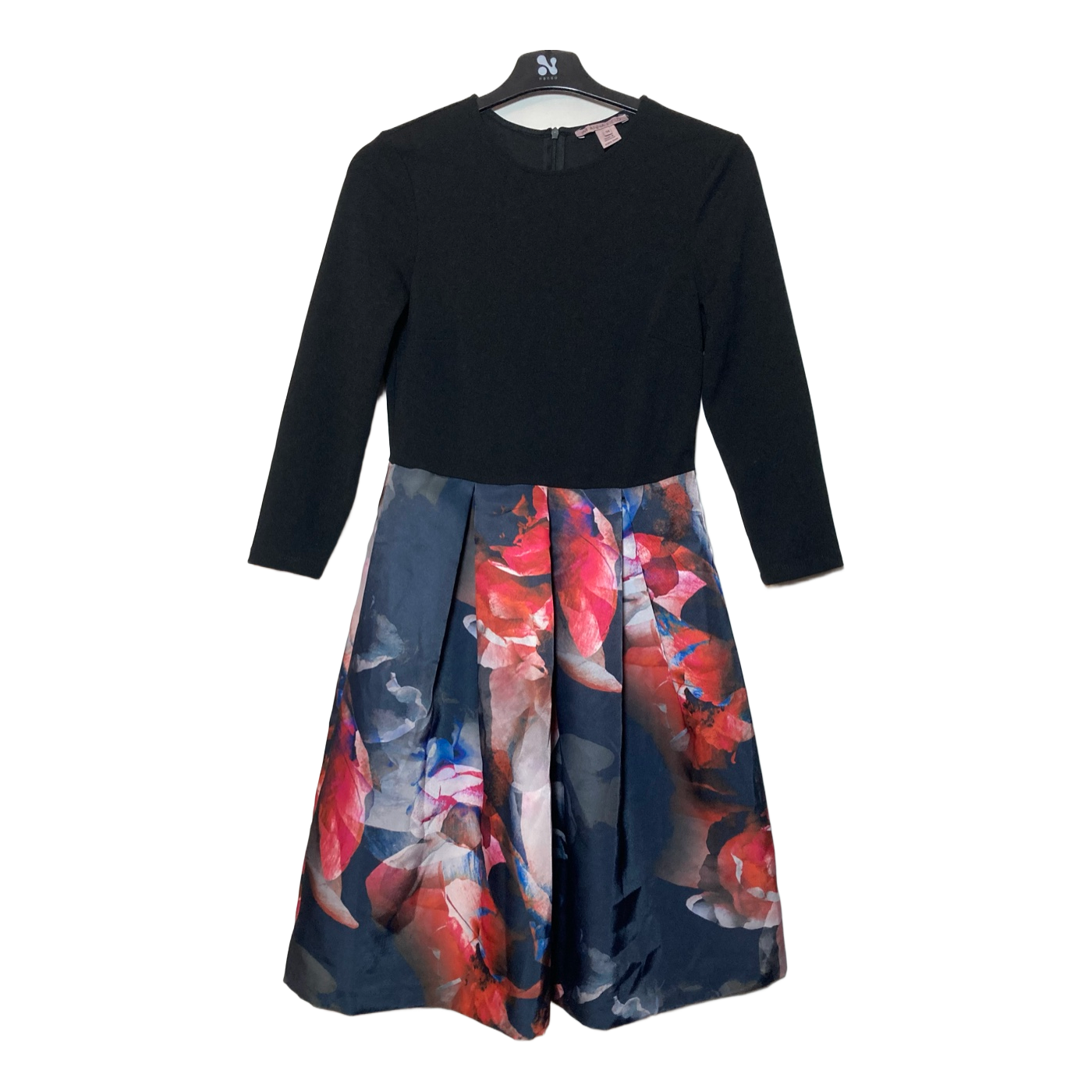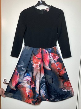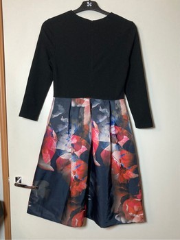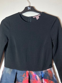 Anna Field stylish black dress. Beautiful colorful hem. Hidden zipper at the back. Hem with inverted pleats. Excellent condition. The black fabric is polyester. Hem fabric 95% polyester and 5% elastane. Size 34. Underarm-to-underarm measurement unstretched about 40 cm. Stretches. Waist circumference about 70 cm. Does not stretch. Shoulder seam to waist seam about 40 cm. Length about 97 cm. Sleeve length from underarm about 34 cm.