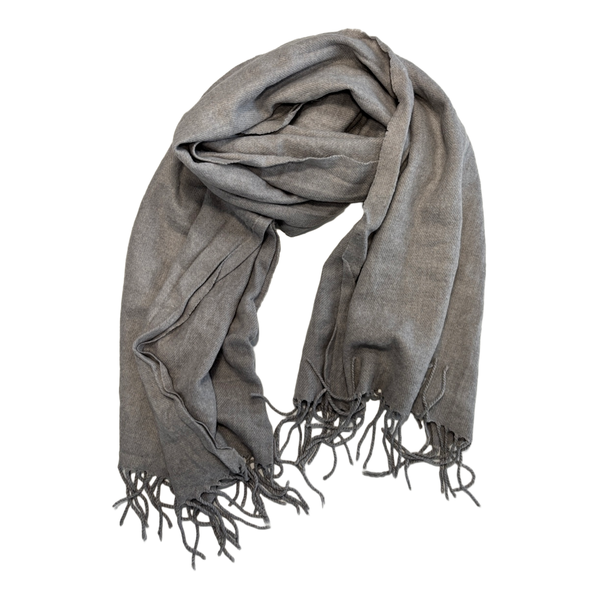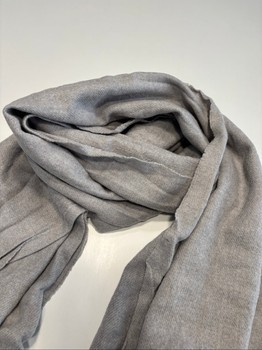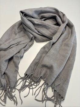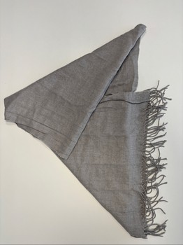 Gray neck scarf. Color light gray. Fringes at the ends of the scarf.
