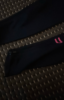 Compression fit leggings with pink detailing. Includes drawstring and zippered ankle openings.