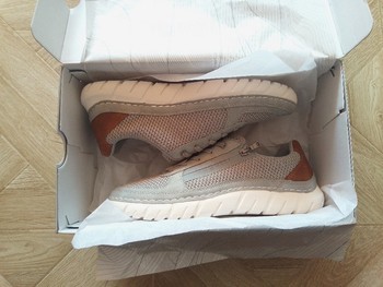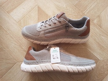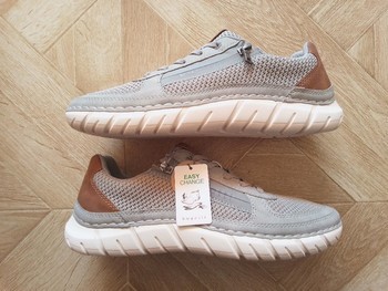 Grey mesh sneakers with brown leather detailing. Features zip closure on the side and a white sole. Size 45. New with tags.