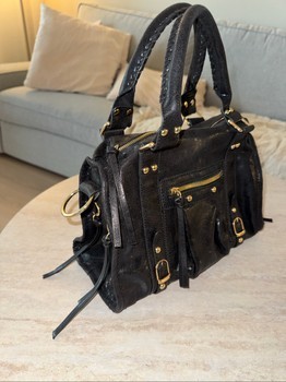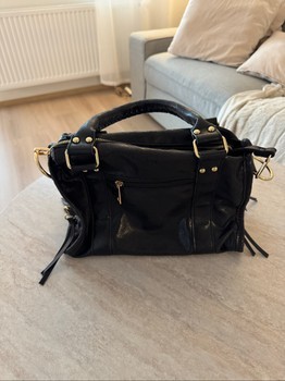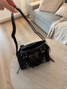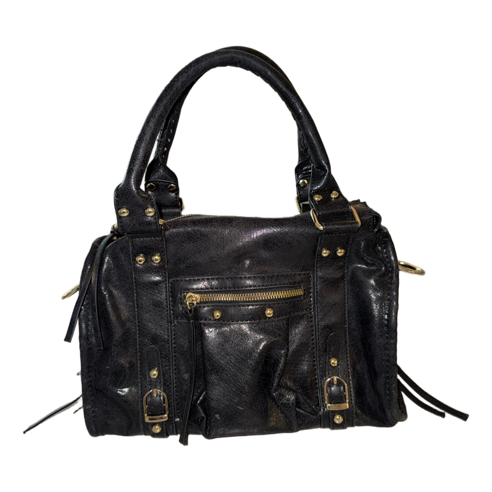 Black faux leather handbag with gold details. Comes with detachable shoulder strap.