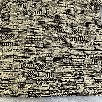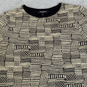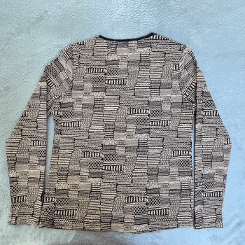 Artsy geometric print black and peach colored jersey knit shirt in size S. Measurements in the pictures. Materials: 95% cotton, 5% elastane. Great pre-owned condition, only minor color fading in the black part of the collar, overall look still very presentable.