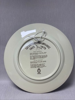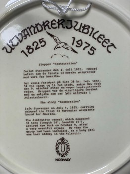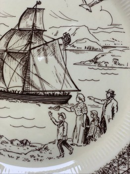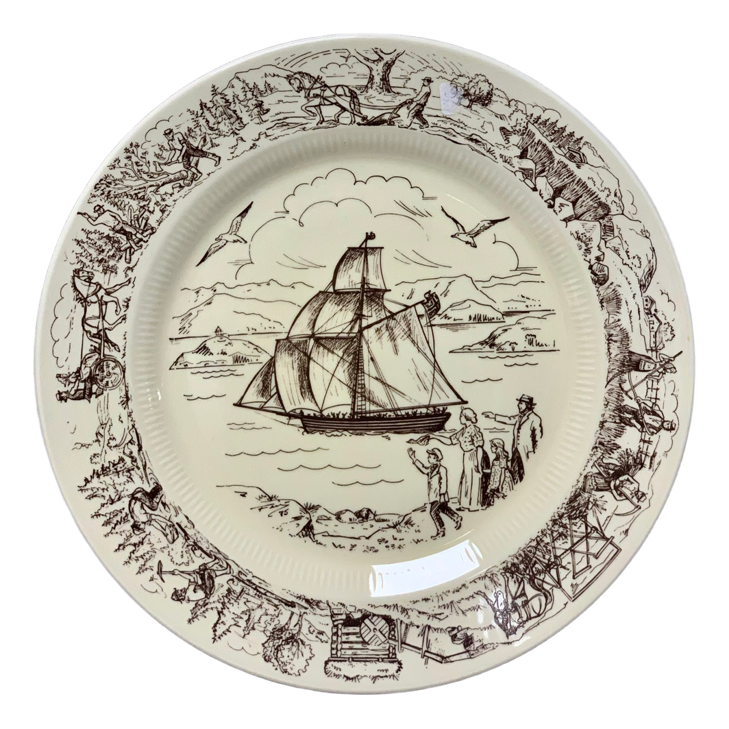Ceramic decorative plate depicting the 1825 emigration to America. Features a brown illustration on a cream background.