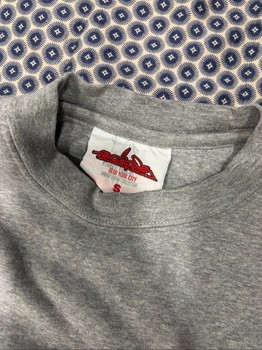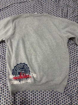 Grey sweatshirt with red embroidered logo on the chest and graphic detailing on the hem. Size S.