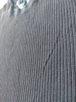 There is fine pilling on the surface. On the back there is a small, very faint mark (see photo). It is almost unnoticeable when worn. Seams show natural wear/fading. Otherwise a clean and intact sweater.