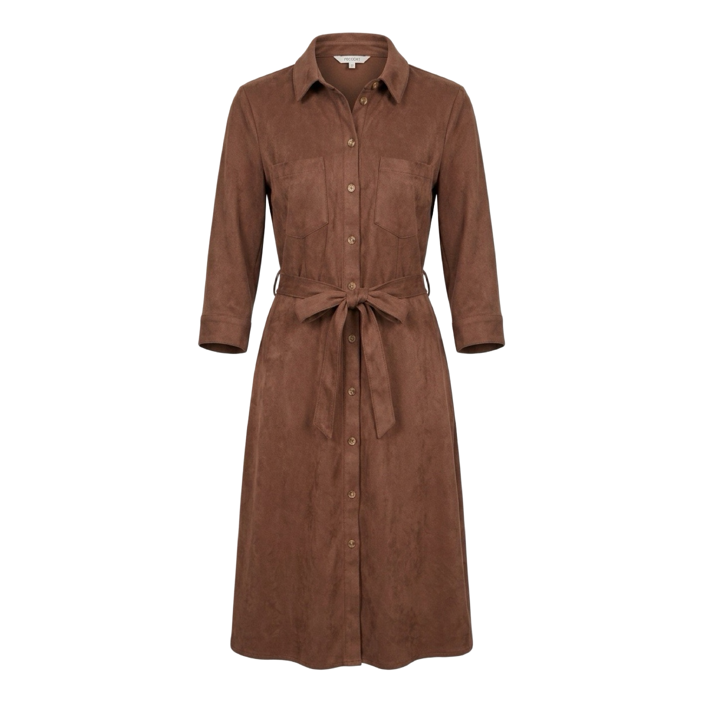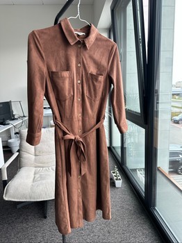 Brown button-up shirt dress with a waist tie and chest pockets. Size 36.