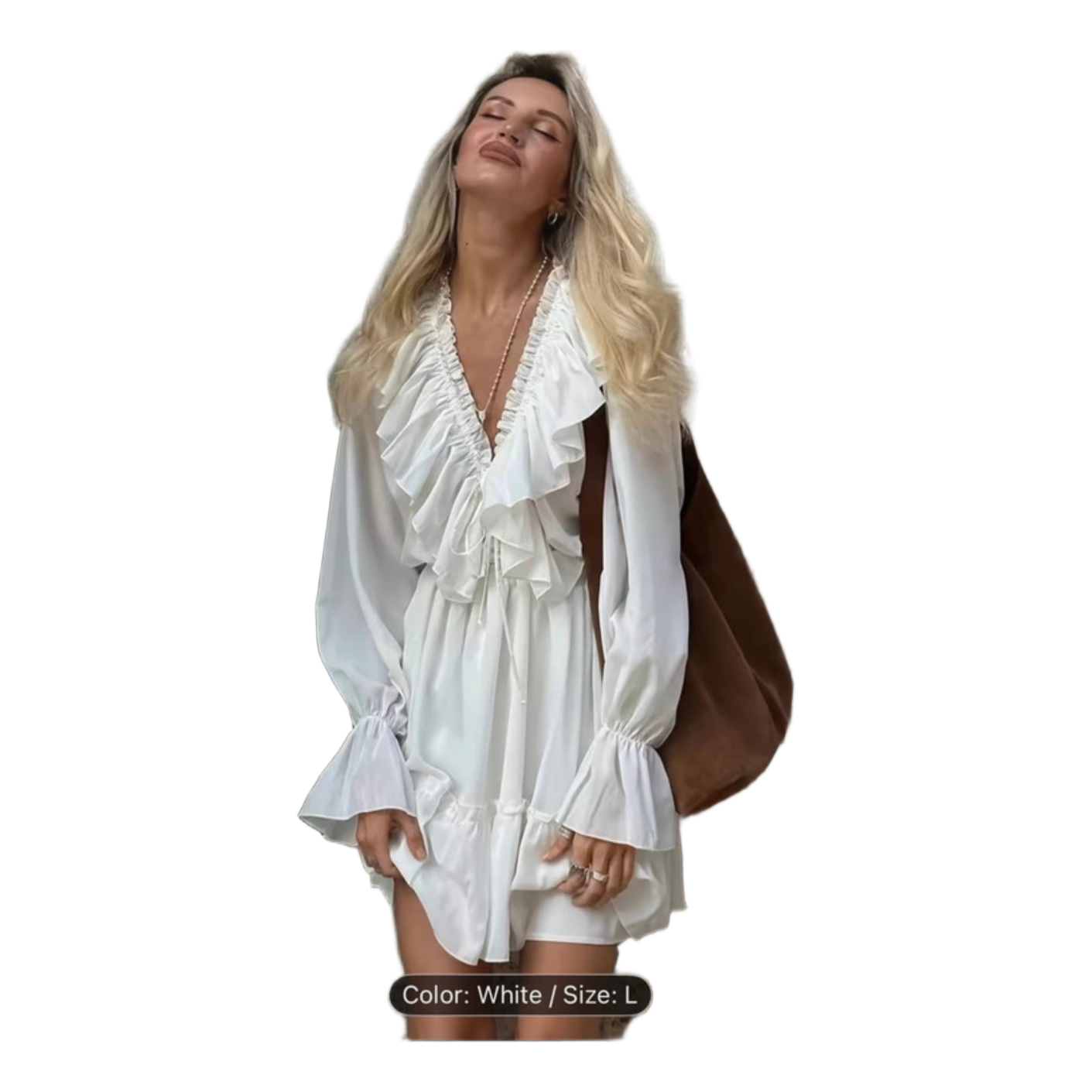 White long-sleeved dress with ruffled neckline and sleeves. Size L.