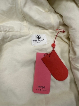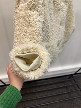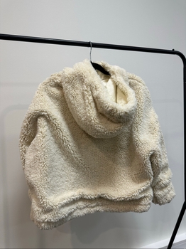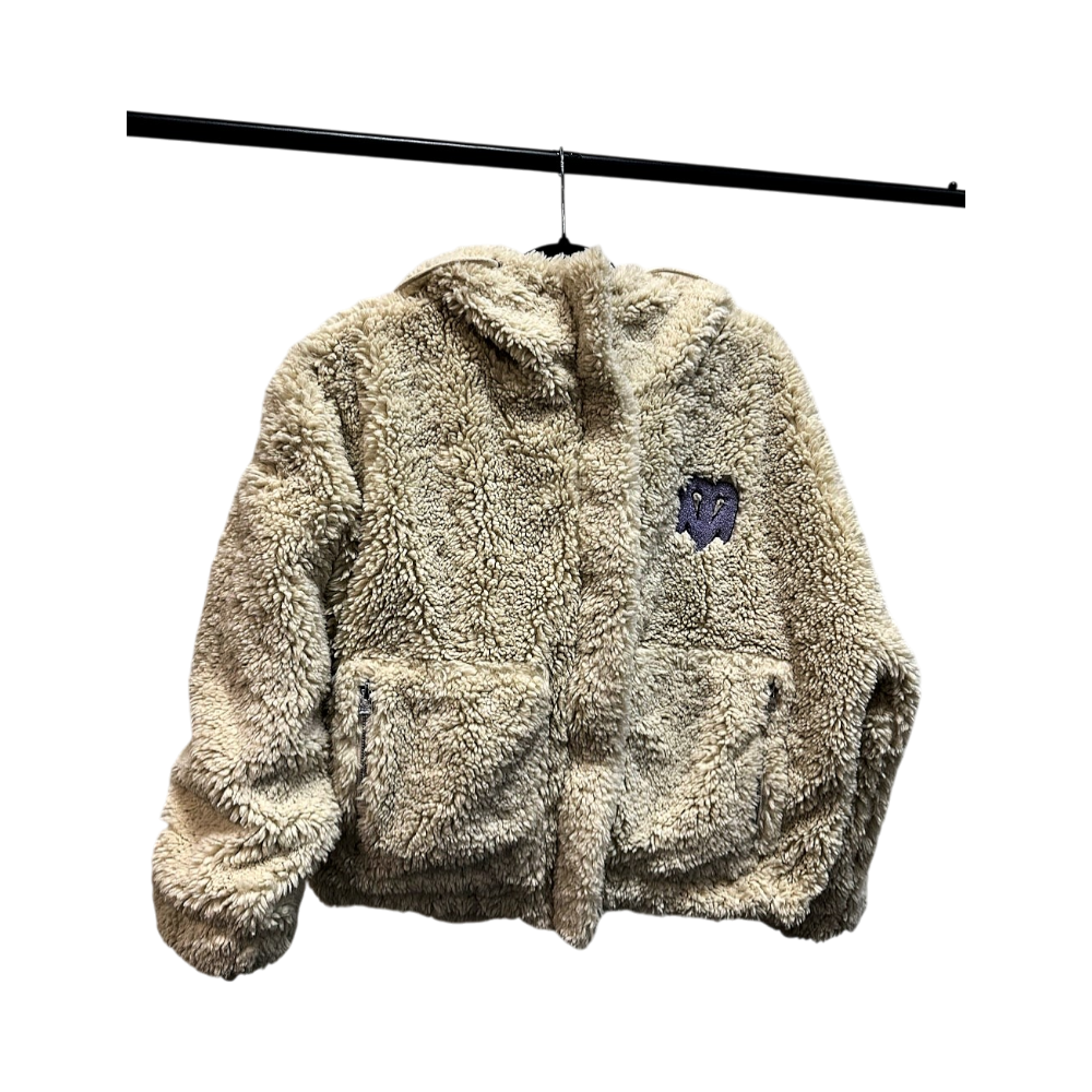 Cream hooded jacket made of fluffy material. Features a full-zip front and an embroidered purple detail on the chest. Includes ribbed cuffs and original tags.