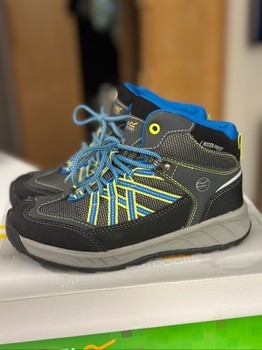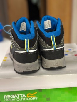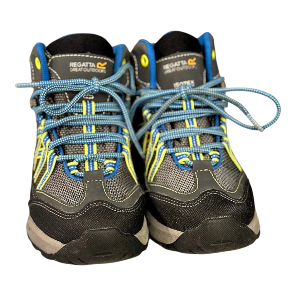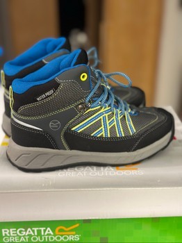 Regatta hiking boots with blue laces and yellow accents. Features a 'Water Proof' label.