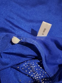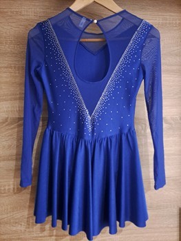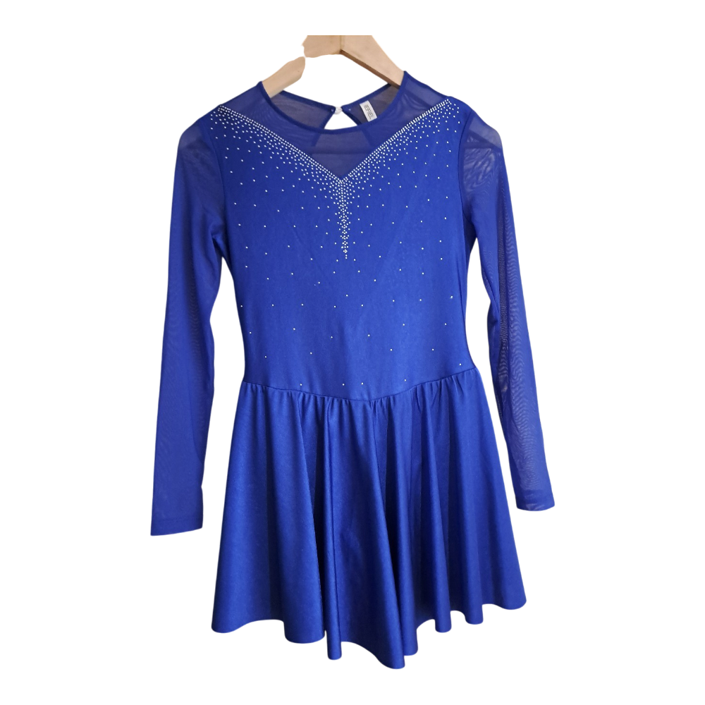Blue skating dress with mesh sleeves and rhinestone embellishments. Features a back cutout and button closure. Size S.