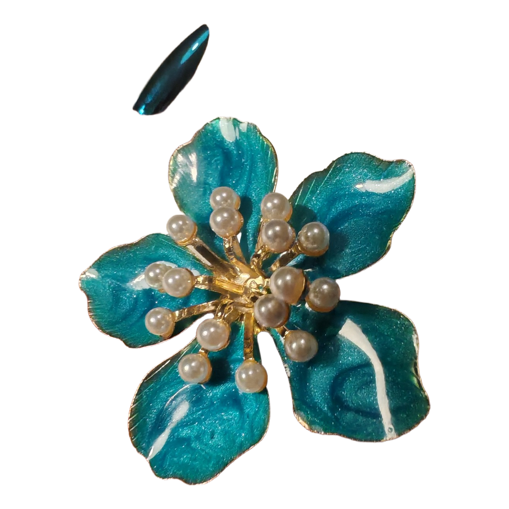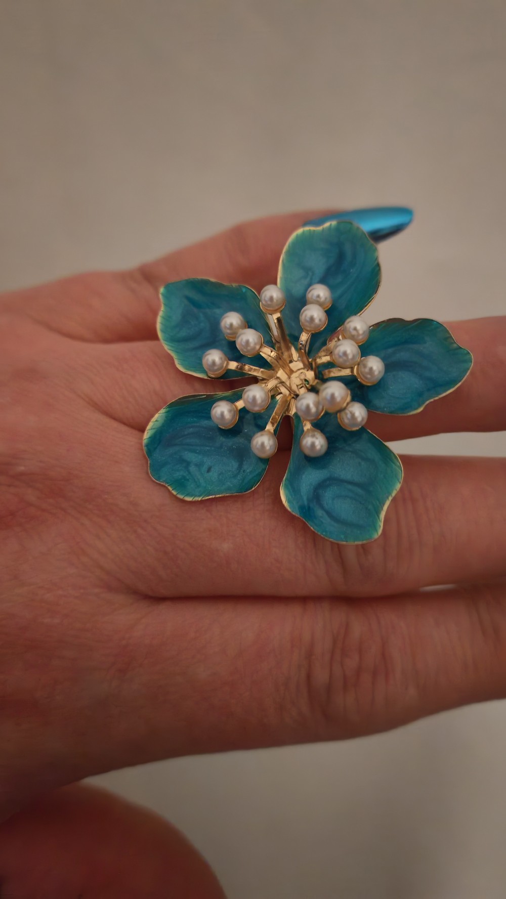 Showy turquoise flower ring with mother-of-pearl decorations.
