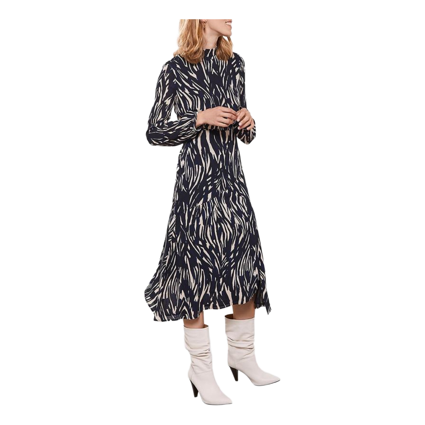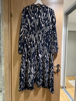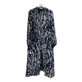 Long-sleeved midi dress featuring a navy and white abstract zebra print. Designed with a high neckline and a tiered skirt. Size 16.