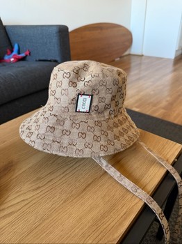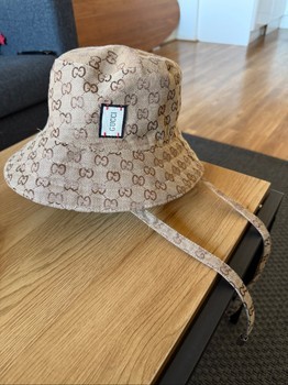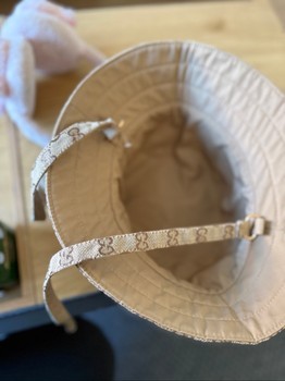 Beige bucket hat with iconic monogram print and logo patch. Includes chin strap.