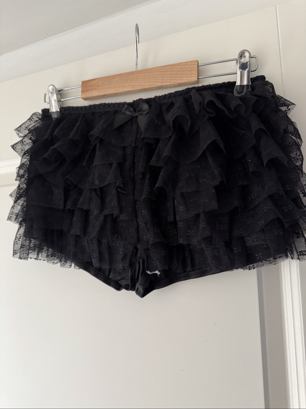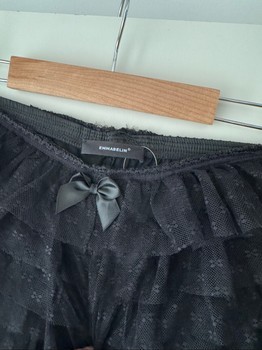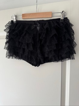 Black women's shorts with layered lace ruffles and a small bow at the front.