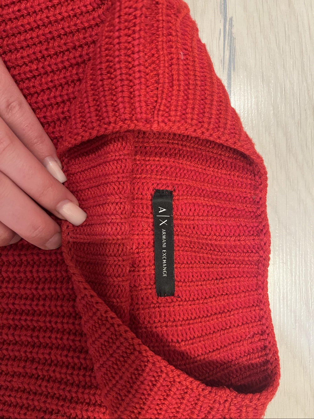Armani Exchange knit sweater in red. Features a ribbed texture and a mock neckline.