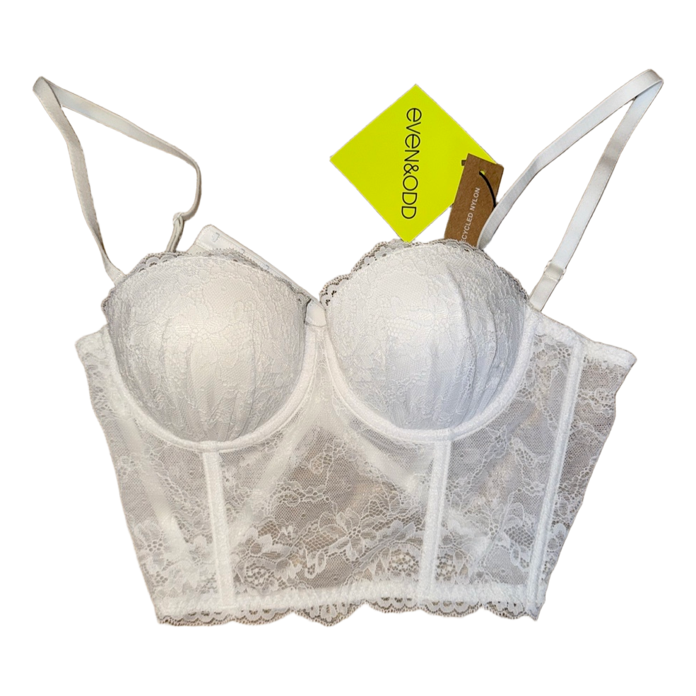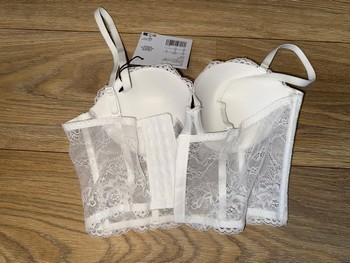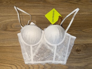 White lace corset bra with adjustable straps. Features hook and eye closure on the back. New with tags.