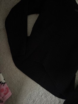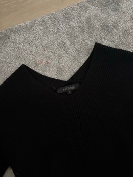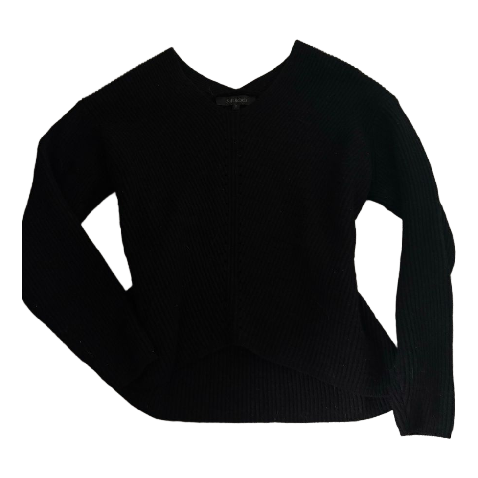 Black long-sleeved knit sweater, with a V-neck. Size S.