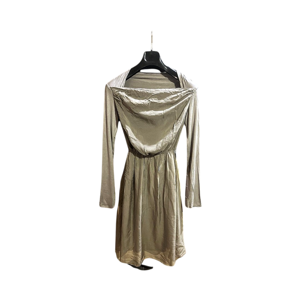 Dress featuring a grey color with a draped neckline and long sleeves. Made from 100% silk with a viscose lining.