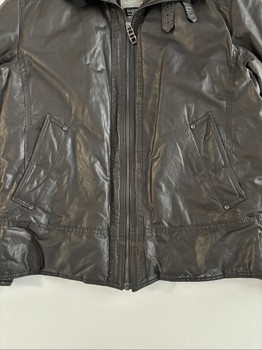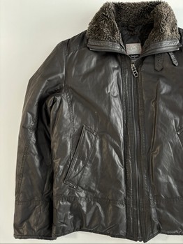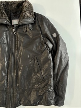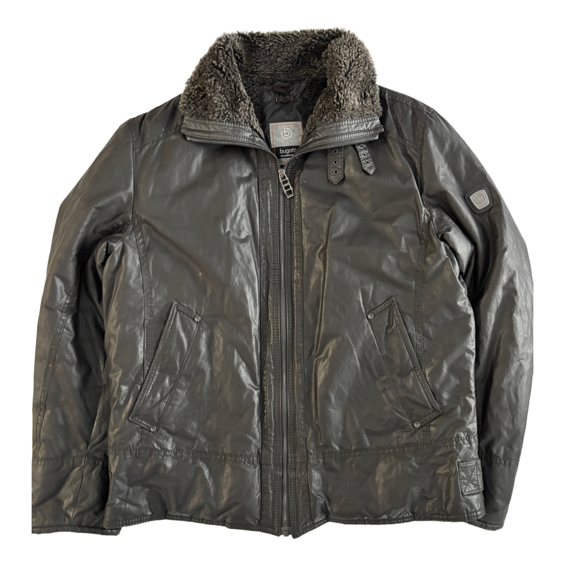 Bugatti-branded men's winter coat. Collar has fur lining on the inside. Collar can be worn either folded or straight, in which case two buckles are visible. The fur lining continues inside the coat to about chest height. Additionally, there are zippered chest pockets on both sides inside the coat.