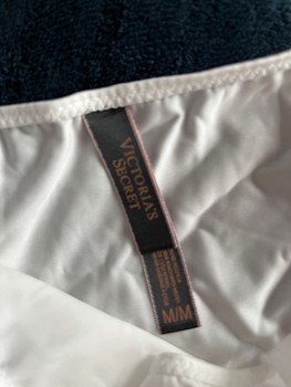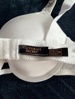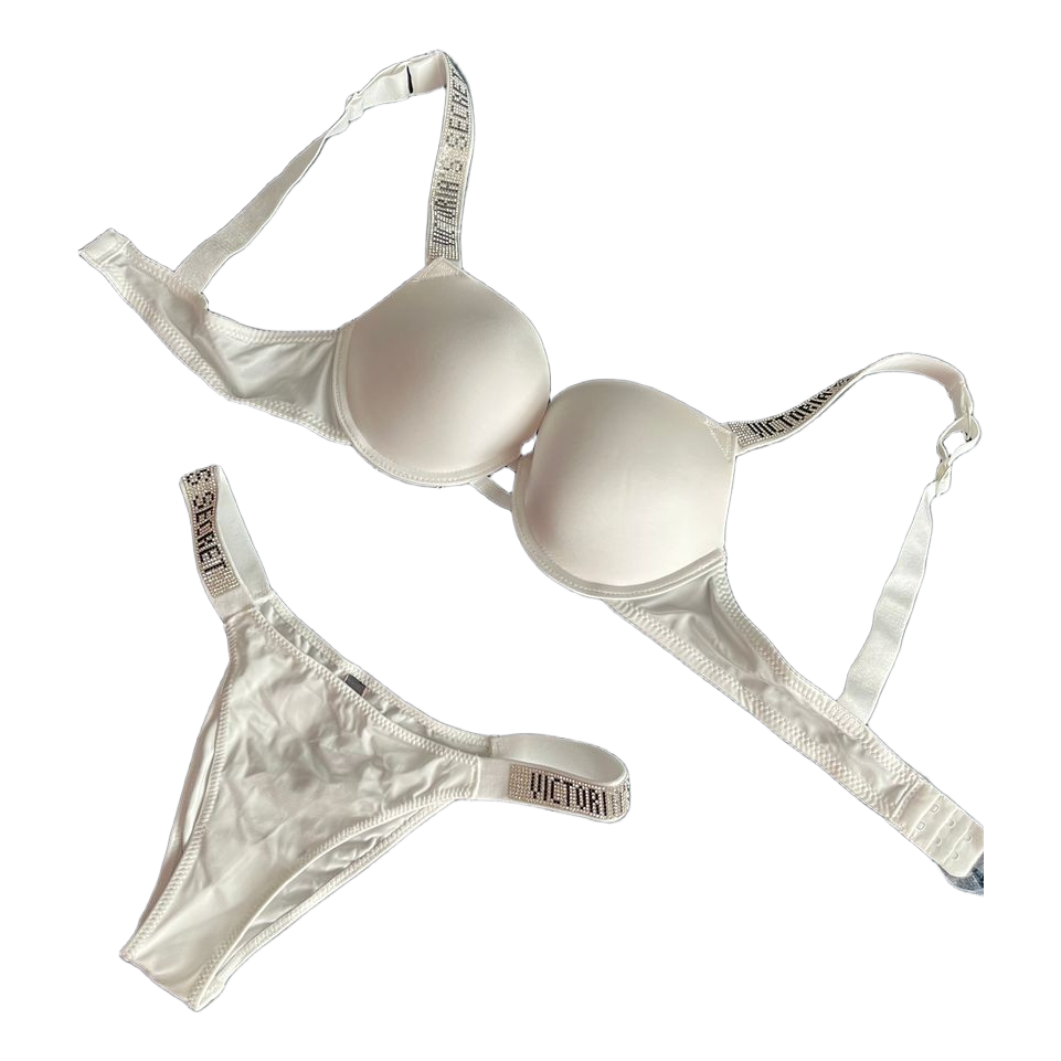 White bra and matching thong set featuring crystal logo detailing. Bra size 75B, thong size s-m