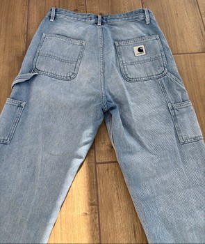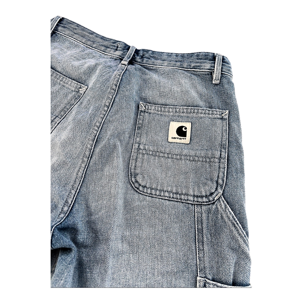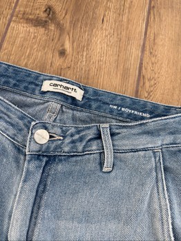 Light blue boyfriend fit denim jeans by Carhartt. Featuring a classic five-pocket design and button closure.