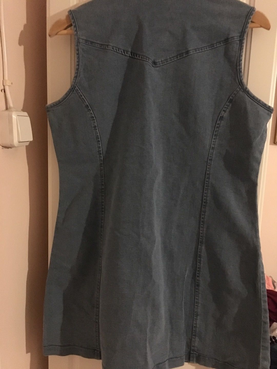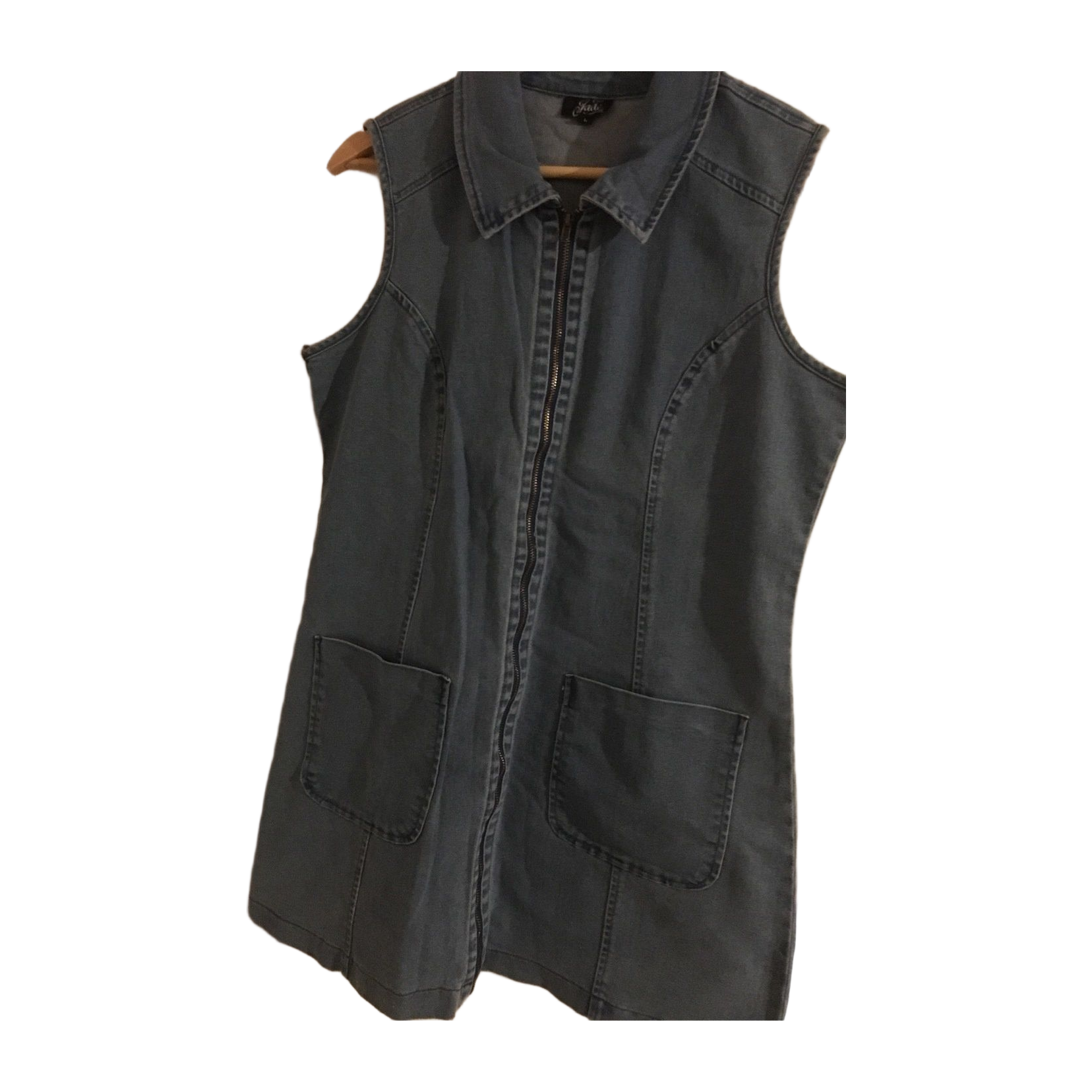 Jade's denim vest slightly flaring downward, pockets at the front. The denim vest has not been used at all.