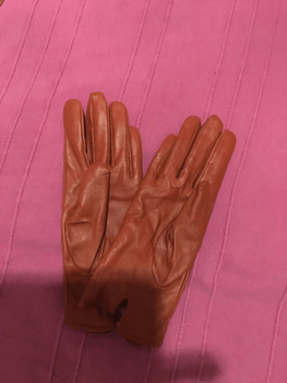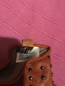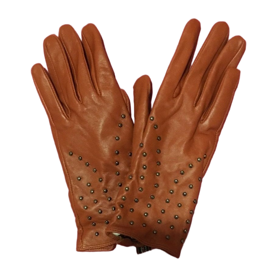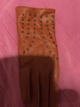 Leather gloves with decorative studs. Upper is genuine leather and lining is acrylic. Size 7, i.e. corresponds to medium. Color is orange-brown. The gloves have not been used at all, so are like new.