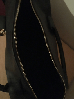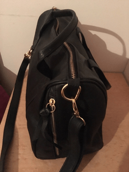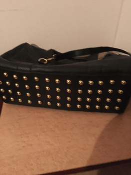 Black bag, with gold-colored zipper closure and gold-colored stud decorations on the base. On the outside at the sides there are zippered pockets and on the inside a zippered pocket, as well as two open pockets. The bag has been used, but is still in neat condition inside and out. Bag dimensions are height 28 cm, width 36 cm, depth 12 cm. Adjustable shoulder strap and also carrying handles.