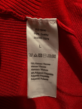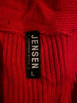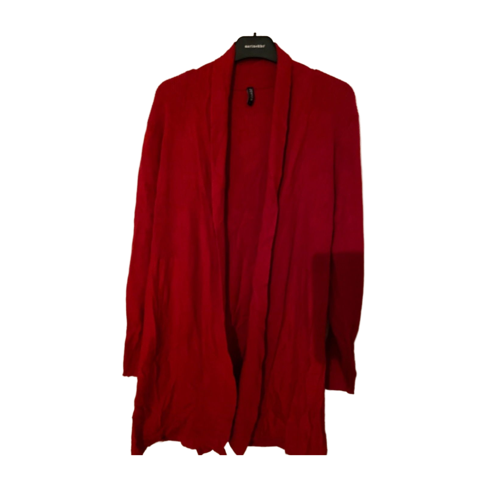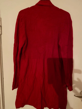 Lovely Christmas-red cardigan. Slightly wrinkled from storage. Only the tags have been removed from the cardigan, it has not been used at all. Measurements are length from shoulder to hem 87 cm and armpit-to-armpit 54 cm. The jacket is a stretchy knit.