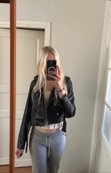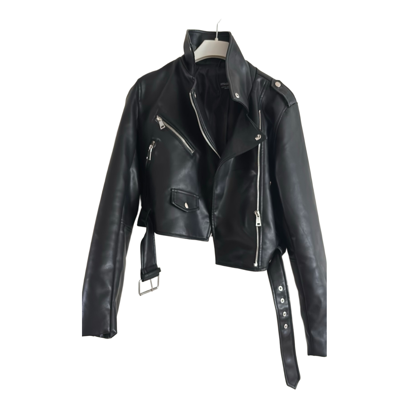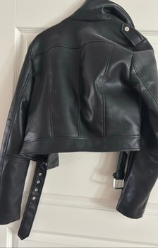 Black short faux leather jacket. Silver zippers and a belt at the waist. Size S but fits more like XS.