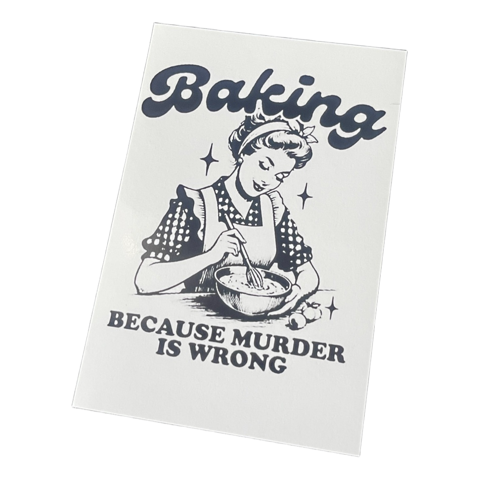 White poster with a vintage-style image and the text "Baking because murder is wrong". Size 10cm x 15cm